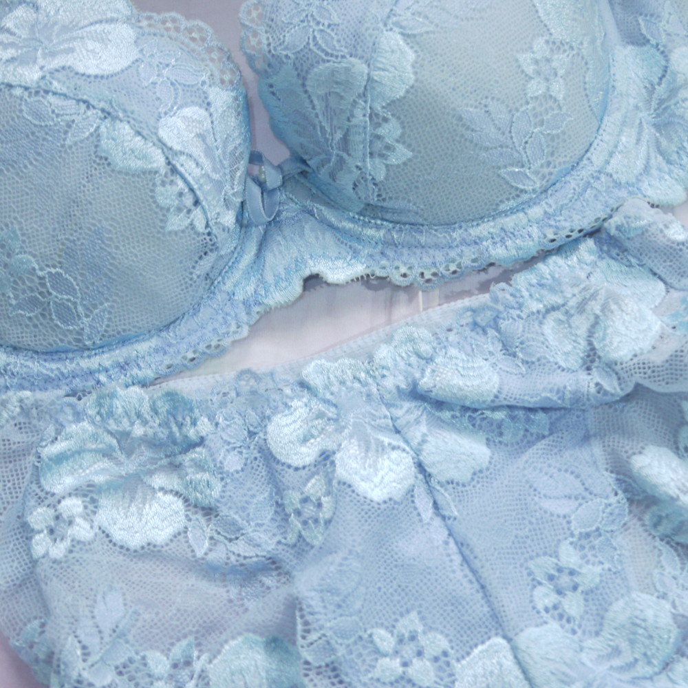 【BCランク/B43ー】Exabra:E68.5 Mサイズ ★ 清楚感溢れるライトブルー 花刺繍レース 巨乳 PBセット