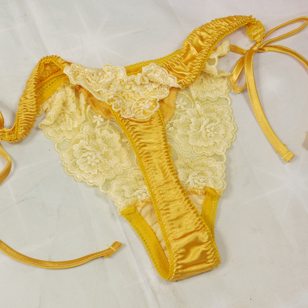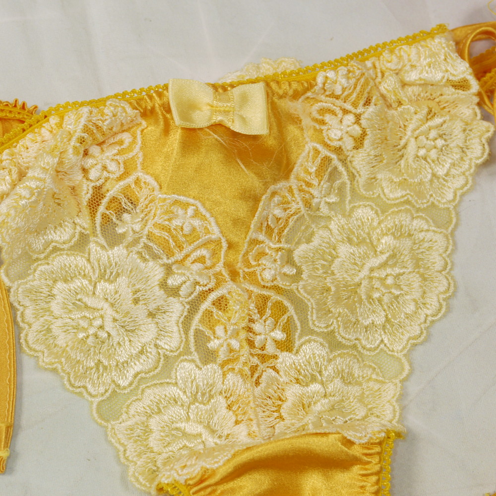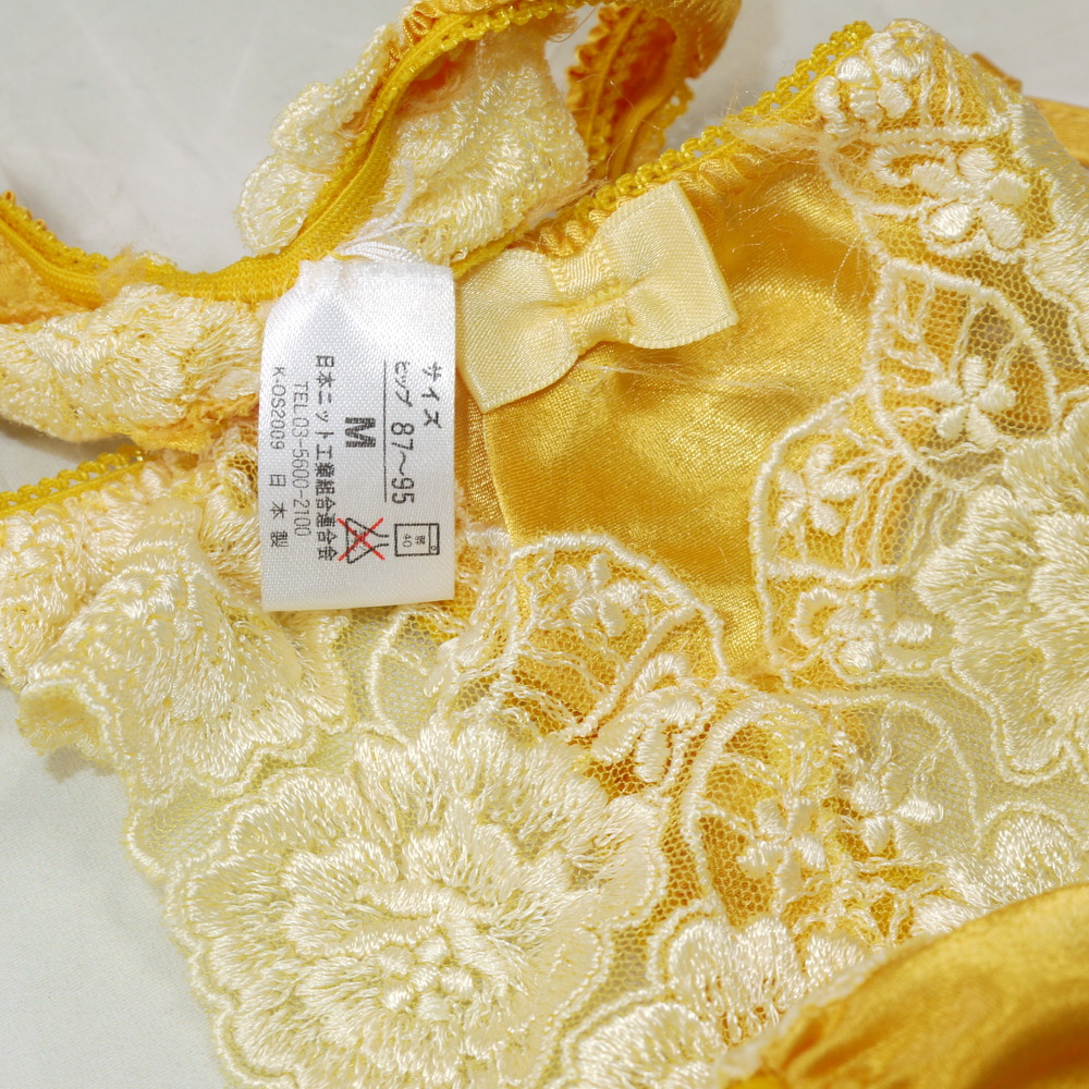 【Bランク/新古美品】日本ニット:Mサイズ ★ 高級感溢れる光沢イエロー×豪華絢爛の花刺繍 紐パン T