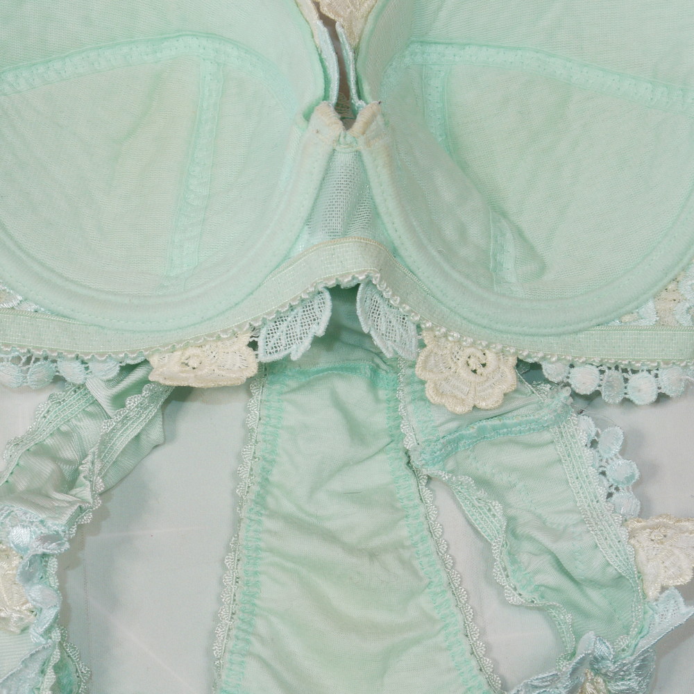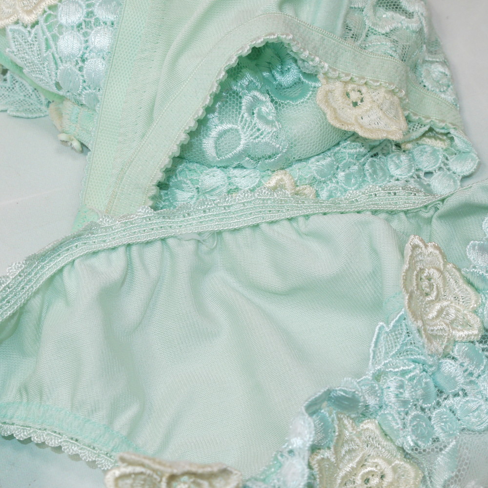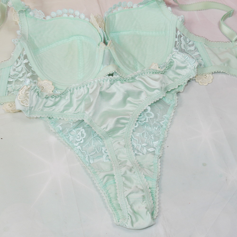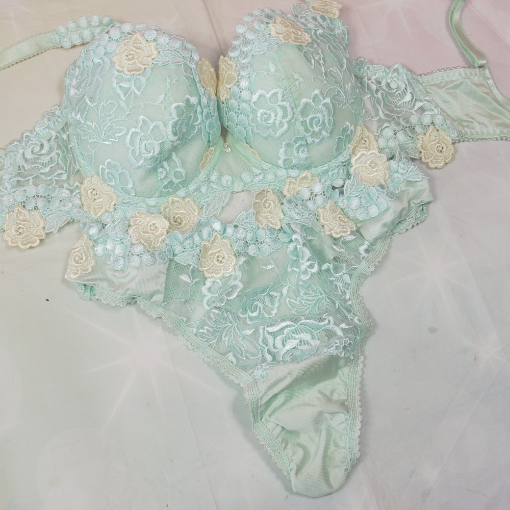 【Bランク/新古美品】トレフル?旧サルート?:DEカップ程 MLサイズ程度 ★ 清楚感溢れるライトブルー×レトロで豪華な花刺繍 T PBセット