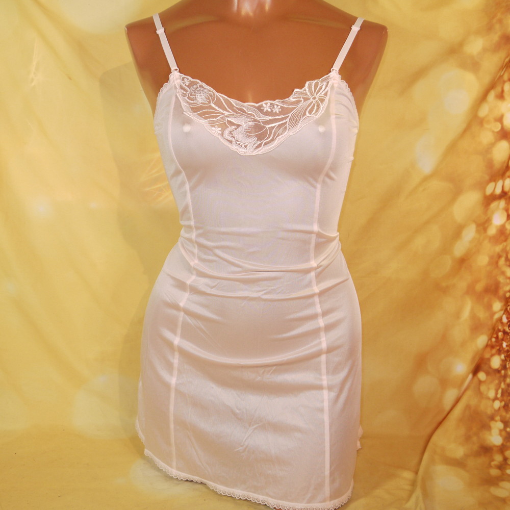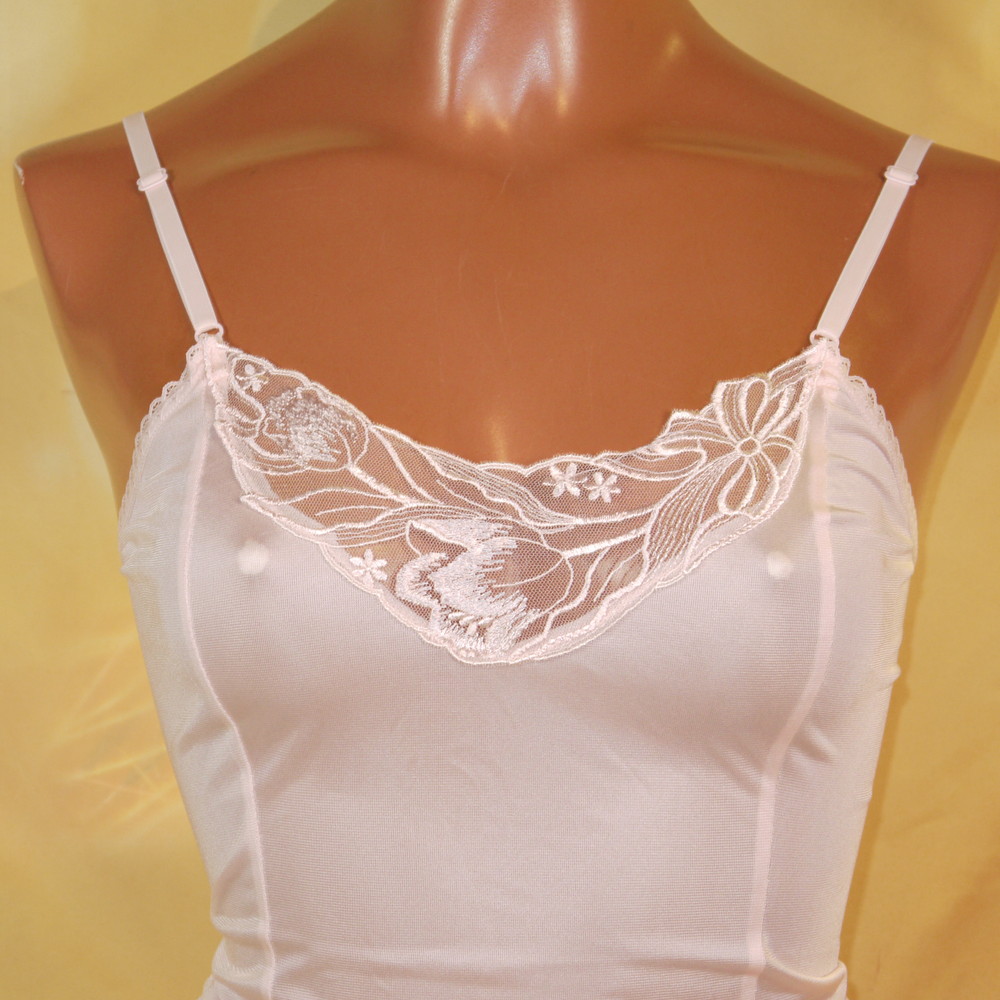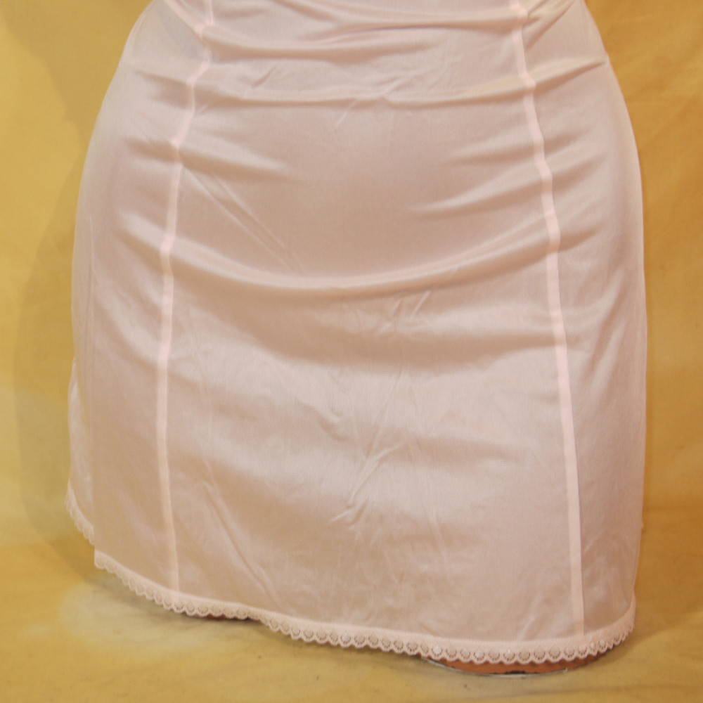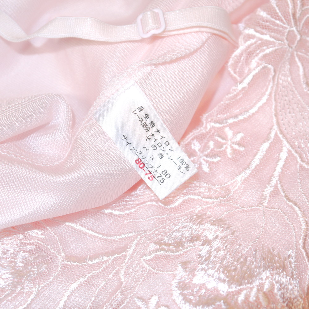 【Bランク/新古美品】セシール:B80:Mサイズ 丈75 ★ 甘ピンク×レトロで大人な大輪薔薇風レース刺繍 しっとりスリップ