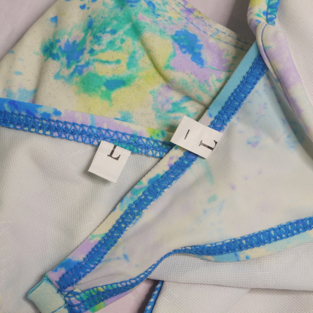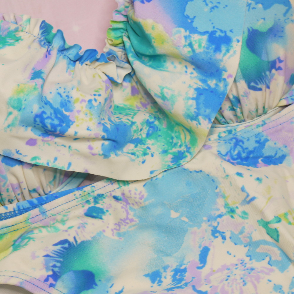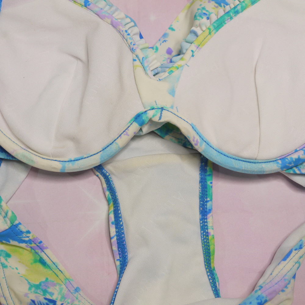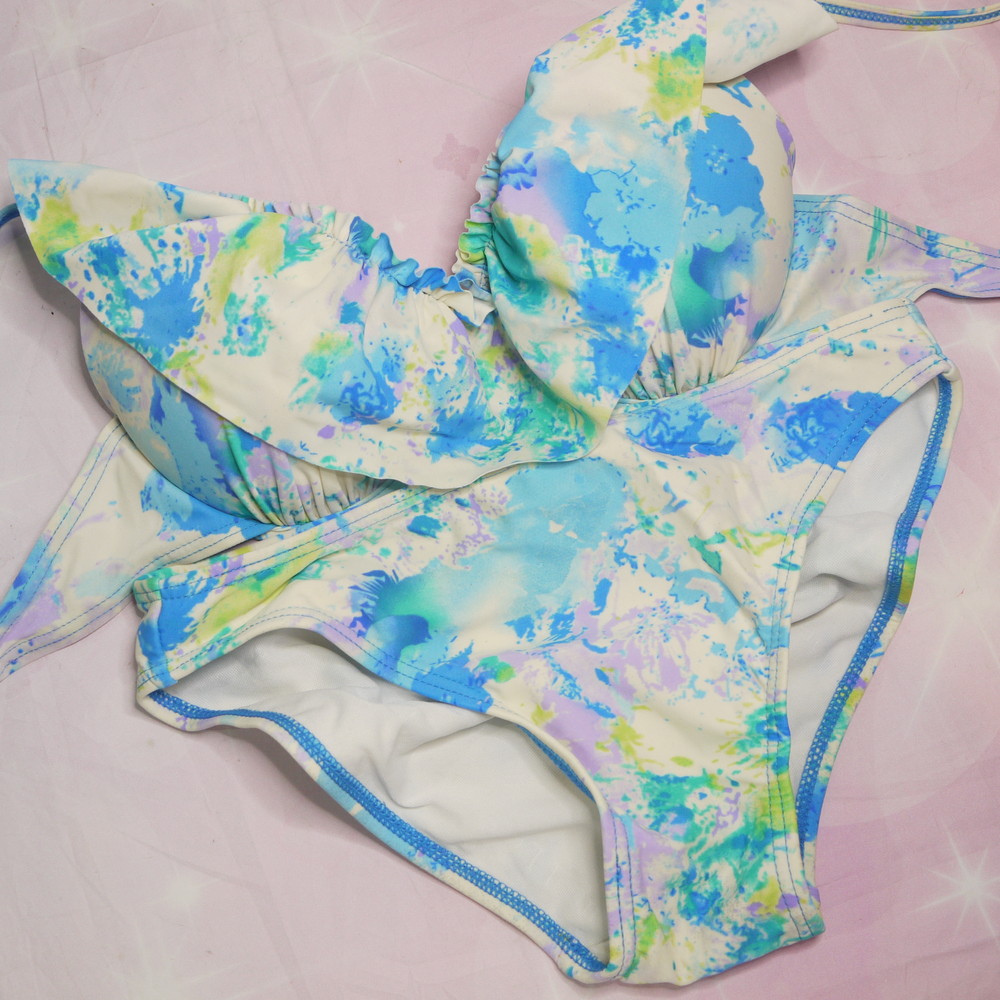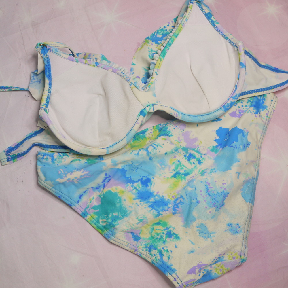 【Bランク/新古美品】:L:CDカップ程 ★ ブルー×お花柄マーブル? フリルが可愛い白ギャル系 ワイヤービキニ