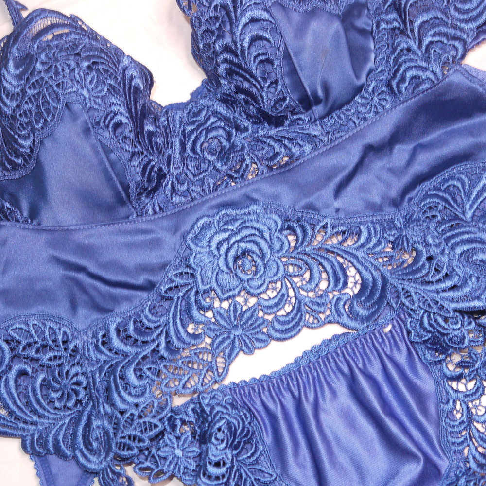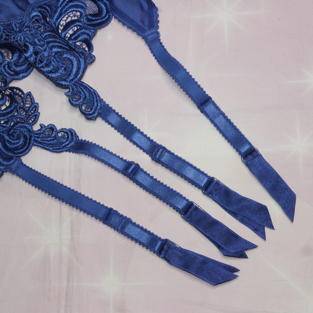 【BCランク/BK43-】スタディオファイブ:C65*80 M ガーター:M ★ シルク調の光沢感ブルー エレガンスリーフ・薔薇 ブラ・T・ガーター 3点セット