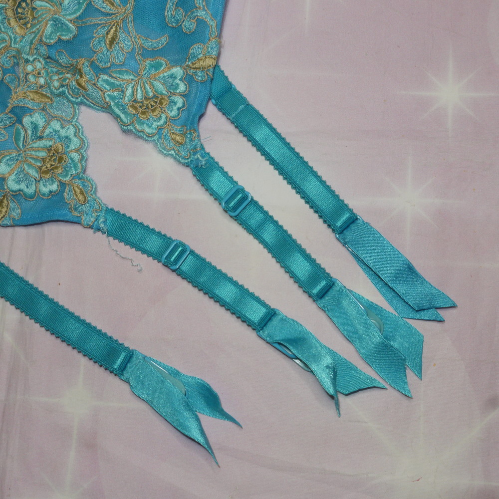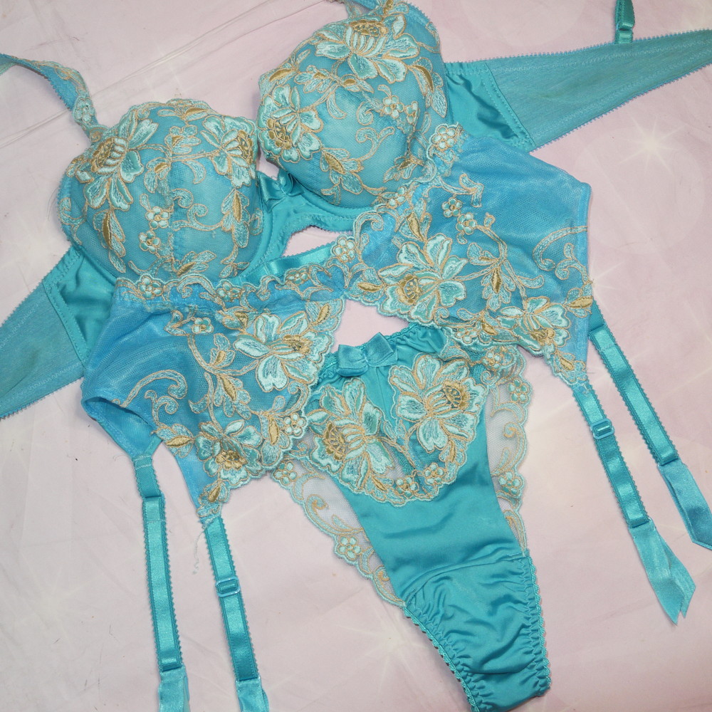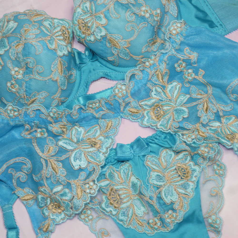 【BCランク/43】スタディオファイブ:C65*80 Mサイズ ★ 艶やかターコイズ×豪華花刺繍 ブラ・T・ガーター 3点セット