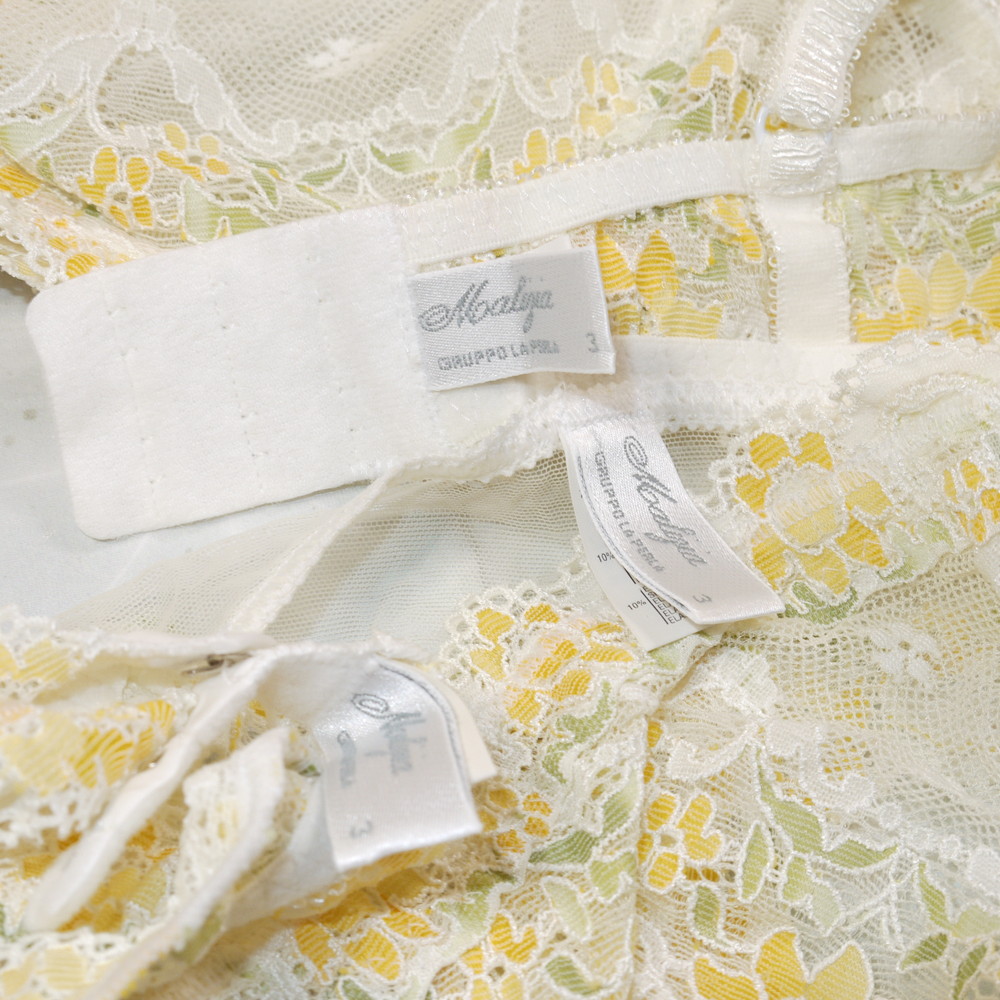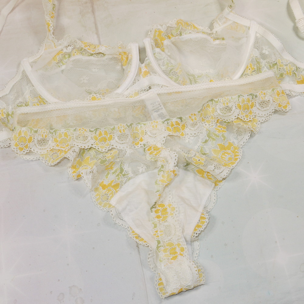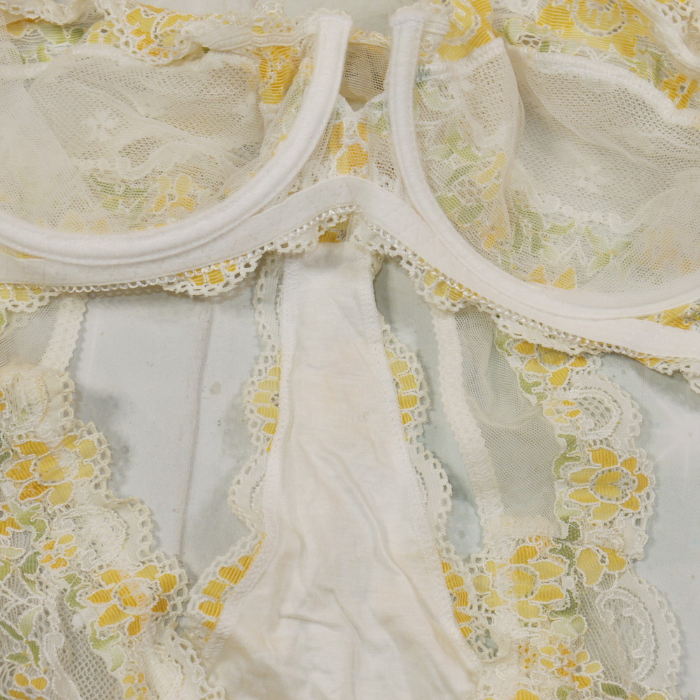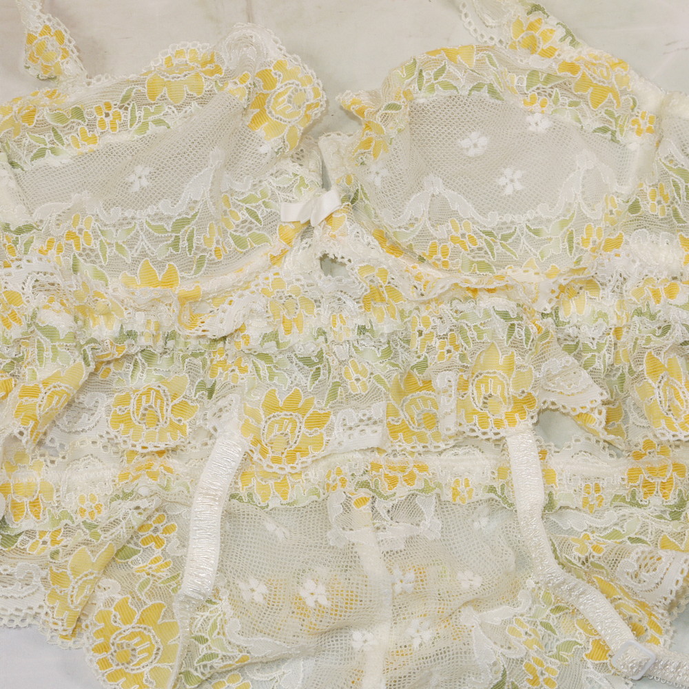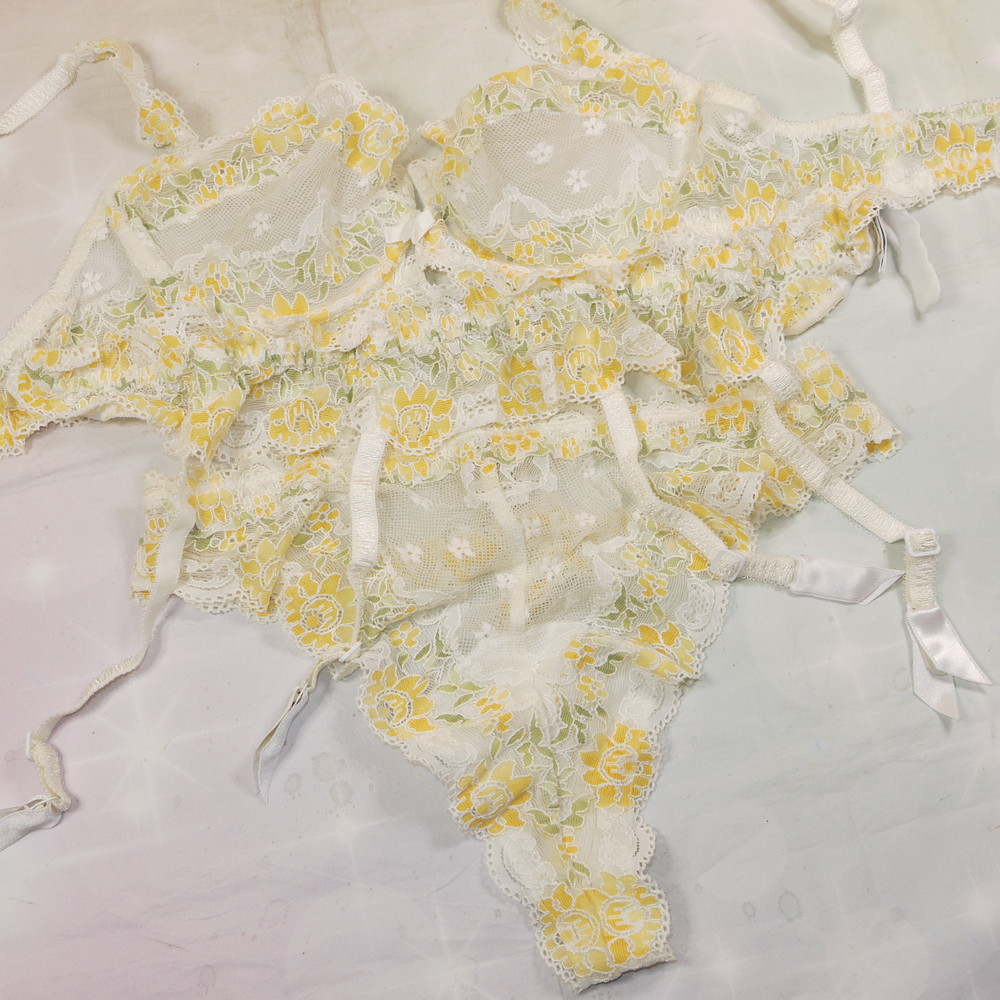 【Cランク】maligia:36:CDカップ程 ML程 ★ レトロで可愛いALLお花柄 透けランジェ T・ブラ・ガーター 3点セット