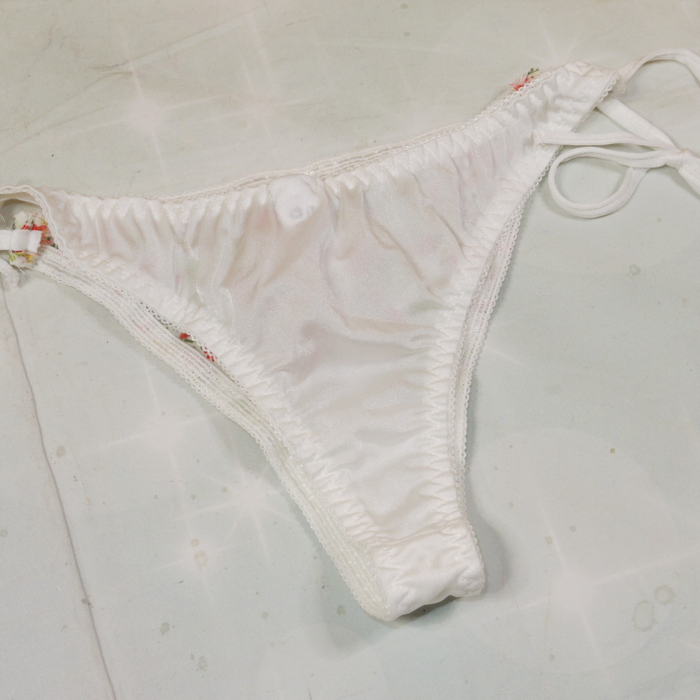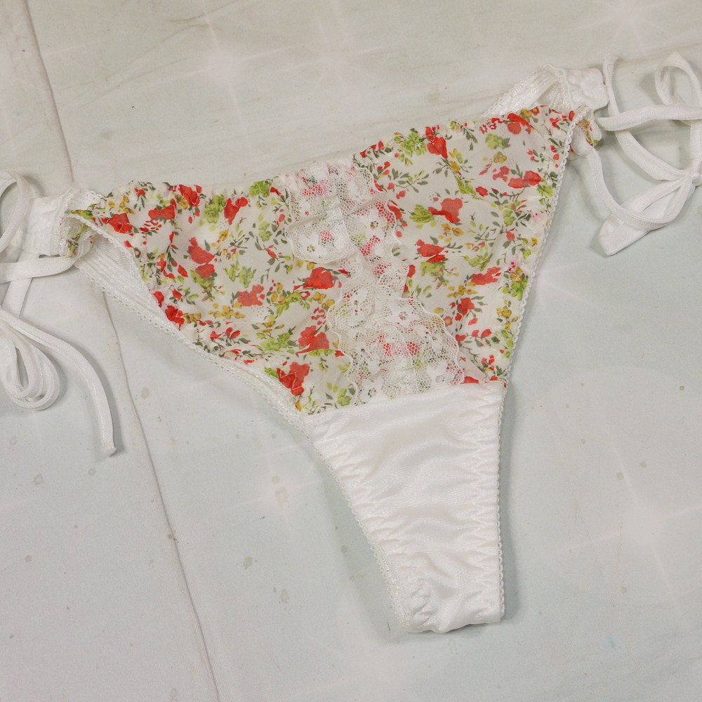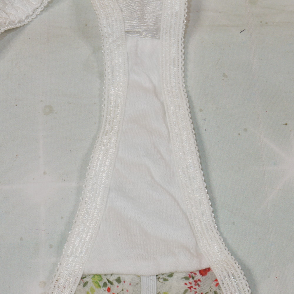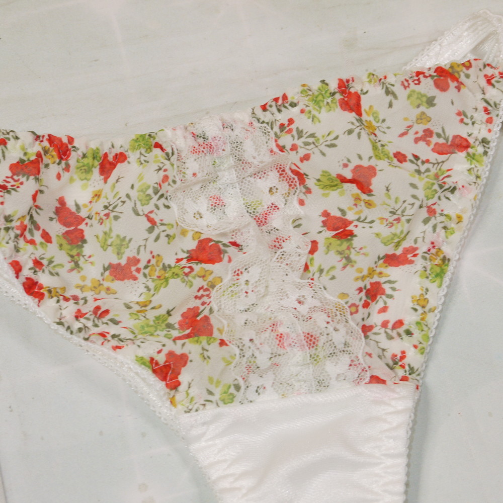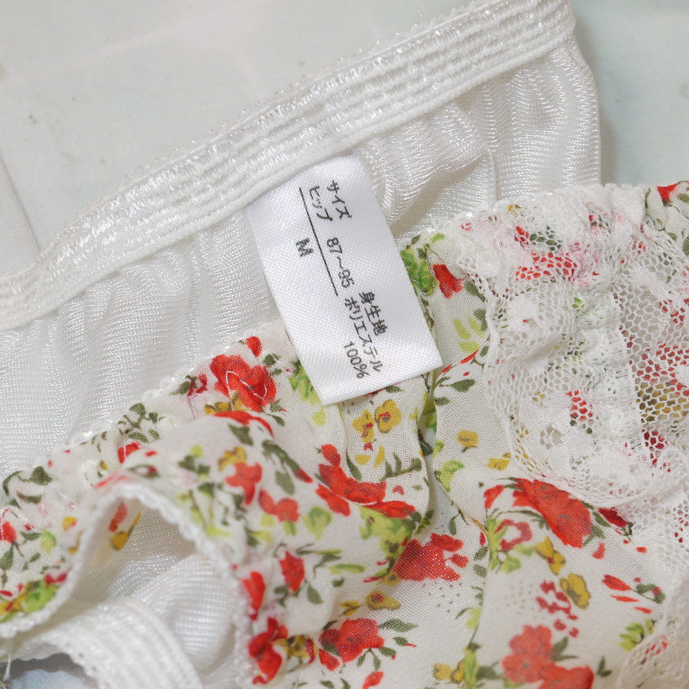 【Bランク/新古美品】サンロード:Mサイズ ★ 甘サテンの白 ヴィンテージなお花柄 あざと系 紐パン Tショーツ